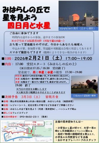 望遠鏡、双眼鏡、デジタル観望機器を用いて、月のクレーターや土星の環、星座や星雲などをのんびりと見るイベントです