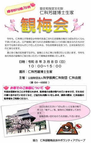 凛と咲く梅の花を愛でながら、皆様とともに博士を偲びたいと思います。今年も地元有志の皆様の協力をいただいて観梅会を開催いたします。