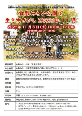 11月は倉敷みらい公園もすっかり秋!木の葉舞い散る公園内では、どんな生き物がみつかるでしょうか。