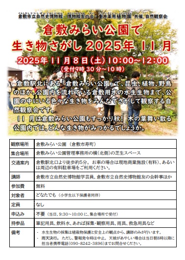 倉敷駅北にある「倉敷みらい公園」で、昆虫、植物、野鳥のほか、公園内を流れている倉敷用水の水生生物まで、公園の中にいる色々な生き物をみんなでさがして観察する自然観察会です。