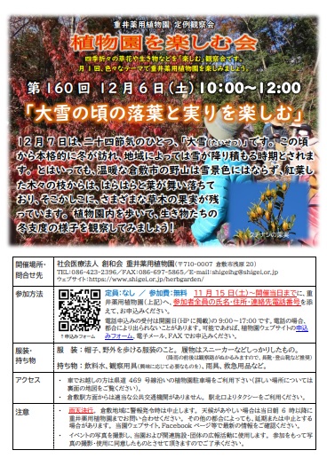 12月7日は、二十四節気のひとつ、「大雪(たいせつ)」です。この頃から本格的に冬が訪れ、地域によっては雪が降り積もる時期とされます。とはいっても、温暖な倉敷市の野山は雪景色にはならず、紅葉した木々の枝からは、はらはらと葉が舞い落ちており、そこかしこに、さまざまな草木の果実が残っています。植物園内を歩いて、生き物たちの冬支度の様子を観察してみましょう!