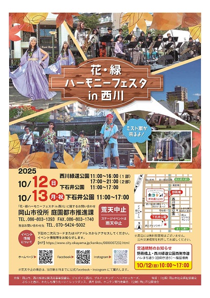 10月のハーモニーフェスタでは「ジャズイン西川」「ロックイン西川」「わたしも踊りた~い!レッツダンス」などによる音楽イベントや、「ぷらっと西川(Eat Up OKAYAMA)」、「満月BAR」による飲食イベントを開催します!
