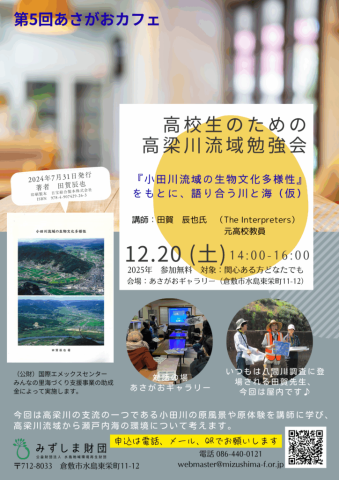 12月20日(土)、高校生のための高梁川流域勉強会を、今回はあさがおギャラリーを会場に屋内で開催します。(第5回あさがおカフェ)